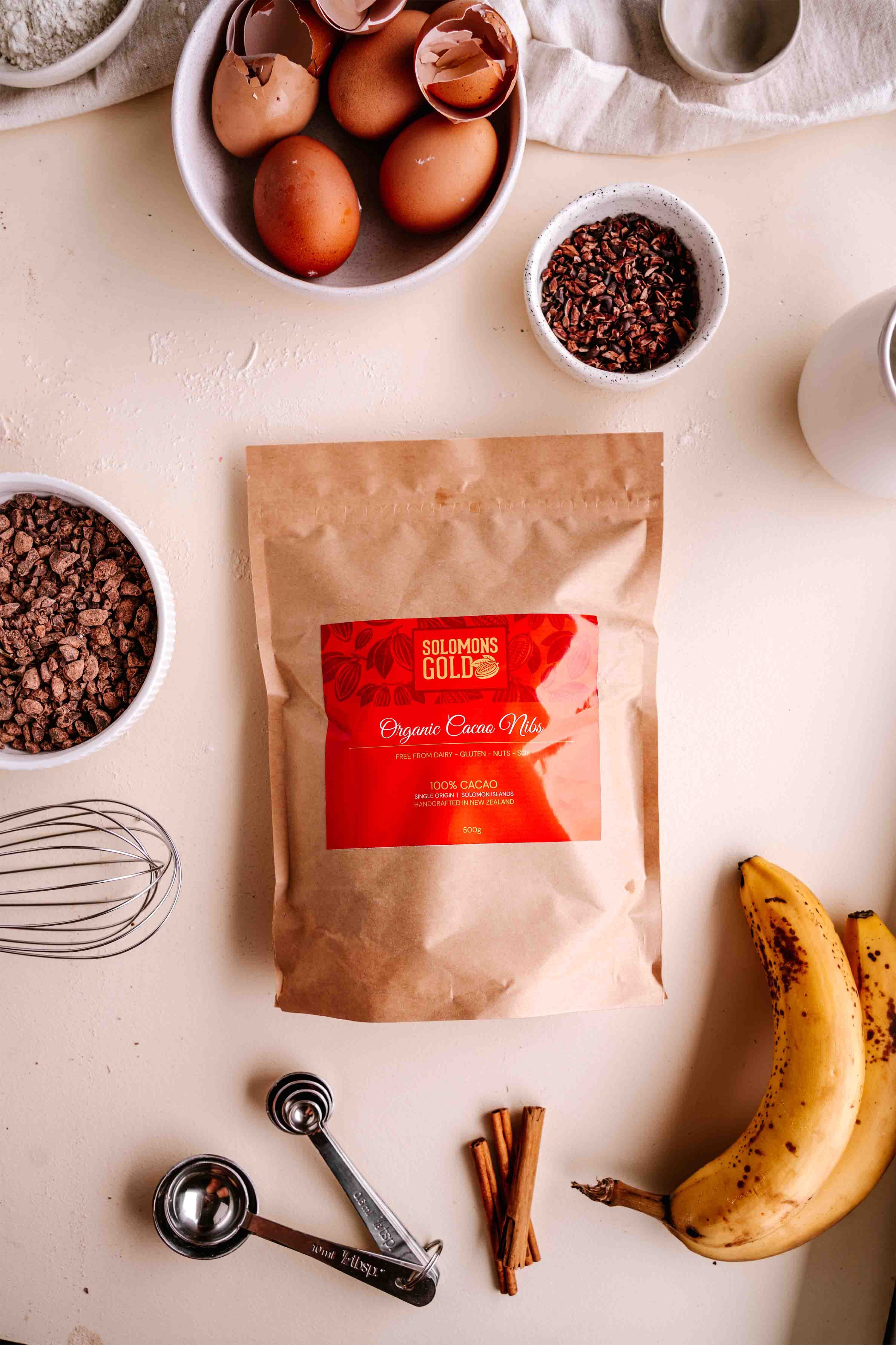 Our Baking Range (includes: 1 x 500g bag 65% cacao chocolate pieces & 1 x 500g bag cacao nibs)